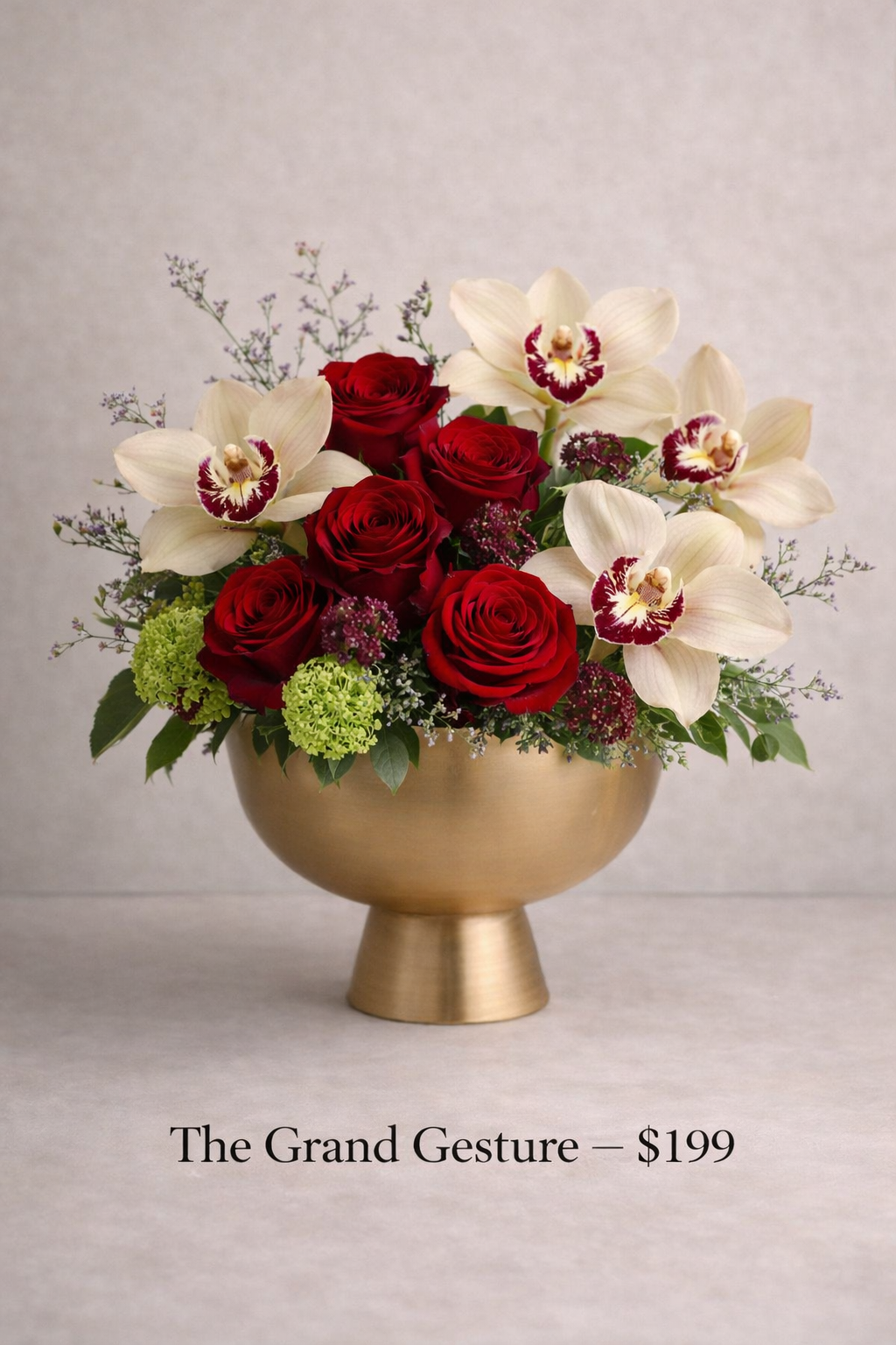 Featuring premium roses and a striking cymbidium orchid, this design is modern, luxurious, and unforgettable.