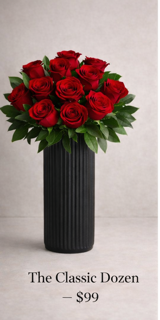 Twelve premium red roses arranged simply and beautifully in a keepsake vase — no guesswork, no stress, just romance done right.